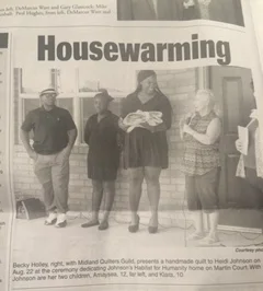 Jackie Ward, second from left, with Midland Quilters Guild, presents a handmade quilt to Stacy Evans and her sons Marlon and Jeremiah at the dedication of Evans' Habitat for Humanity home. Alynda Best, Executive Director of Habit for Humanity is pictured on the far left. Evans' home is the 147th build for Habitat for Humanity in Midland and was completed as a memorial to Clark Moreland, (former Midland County Commissioner, Precinct 3) by his family.